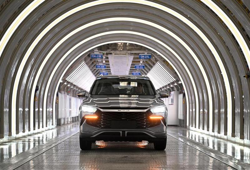 Тази снимка, направена на 3 ноември 2025 г., показва поточна линия за ново енергийно превозно средство (NEV) на BYD, водещият производител на NEV в Китай, в завода на BYD в Джънджоу, провинция Хенан в централен Китай. [Photo/Xinhua]