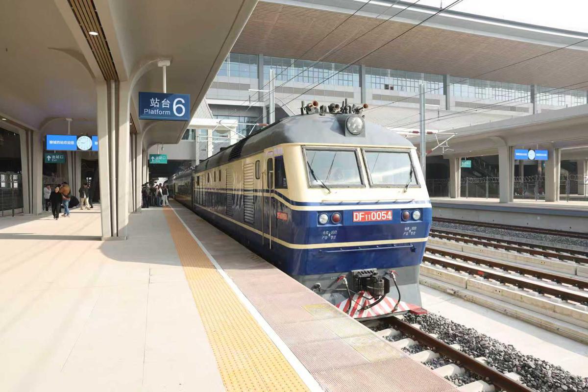 Тестови влак бавно тръгва от западната гара Liaocheng, отбелязвайки официалното начало на съвместното пускане в експлоатация и тестване на участъка Shandong от високоскоростната железопътна линия Xiong“an-Shangqiu, която свързва Xiong’an в провинция Хъбей и Shangqiu в провинция Хенан, ключова част от високоскоростната железопътна линия Пекин-Хонконг. [Photo provided to chinadaily.com.cn]