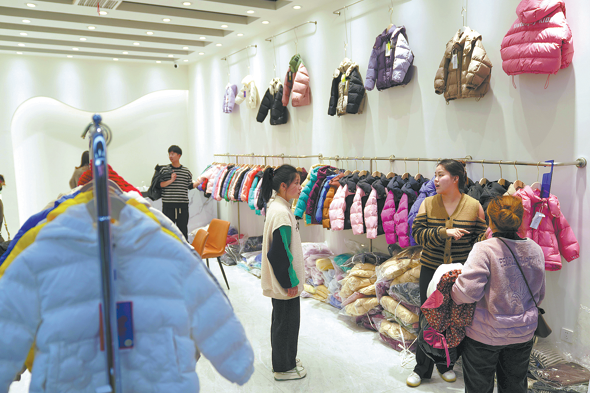 Клиенти избират пухено облекло за деца в търговски център за дрехи в Pinghu, провинция Zhejiang в Източен Китай, на 14 декември 2023 г. HAN CHUANHAO/XINHUA