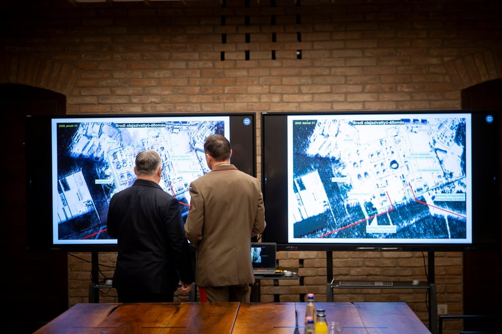 Унгарският премиер Виктор Орбан (вляво) разглежда сателитни снимки, показващи част от петролопровода Дружба по-рано този месец. Снимка: Главният отдел за комуникация на унгарския премиер чрез EPA