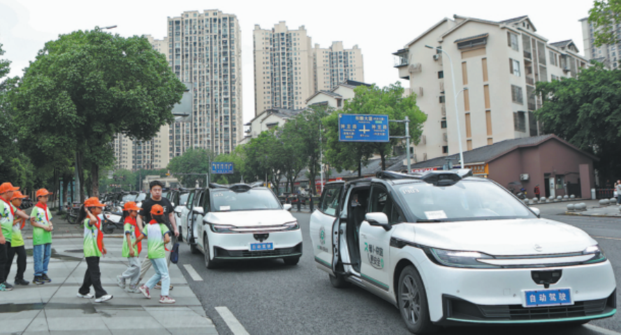 Учениците правят обиколка в Baidu Robotaxis в Chongqing на 1 юни. Chen Shichuan/For China Daily