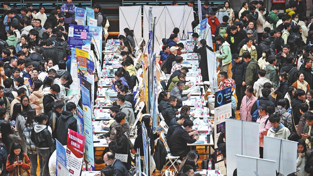 Студентите търсят възможности за работа на панаир на труда на 14 март в Нанкинския университет по аеронавтика и астронавтика в Нанкин, провинция Дзянсу. Повече от 500 компании от цялата страна в области като изкуствен интелект, икономика на ниска надморска височина и нова енергия предложиха позиции. YANG BO/КИТАЙСКА НОВИНАРСКА УСЛУГА