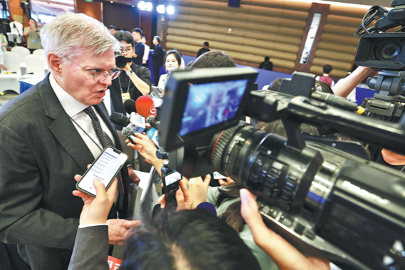 Питър Бърнет отговаря на въпроси на журналисти в кулоарите на годишната конференция на форума Боао за Азия 2026 г. в Боао, провинция Хайнан, в сряда. ДЖАН УЕЙ/КИТАЙ ДЕЙЛИ