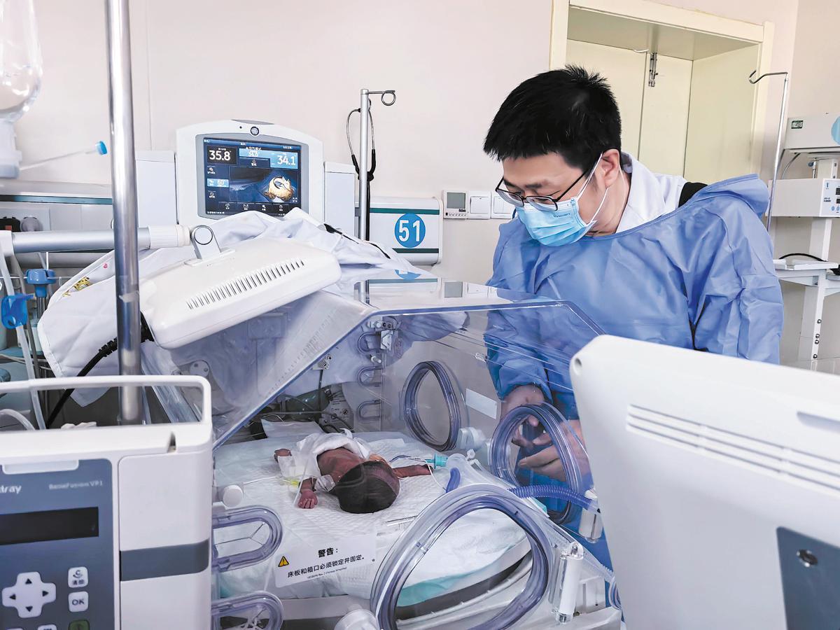 Тиан Конглианг от присъединителната болница на Медицинския университет в Далиан проверява статуса на новородено в отделението за интензивно лечение на новородени в Народната болница на град Нагку в Нагку, автономен регион Ксизанг, през юли. [Photo provided to CHINA DAILY]